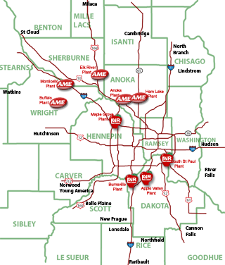 Along with our affiliate AME Red-E-Mix, Inc., we have concrete ready mix plants located in Apple Valley, MN - Burnsville, MN - South Saint Paul, MN - Maple Grove, MN - Elk River, MN - Anoka, MN - Buffalo, MN - Ham Lake, MN and Monticello, MN. Our concrete ready mix trucks deliver to the greater Minneapolis and Saint Paul metropolitan area of Minnesota and to the surrounding communities, including...